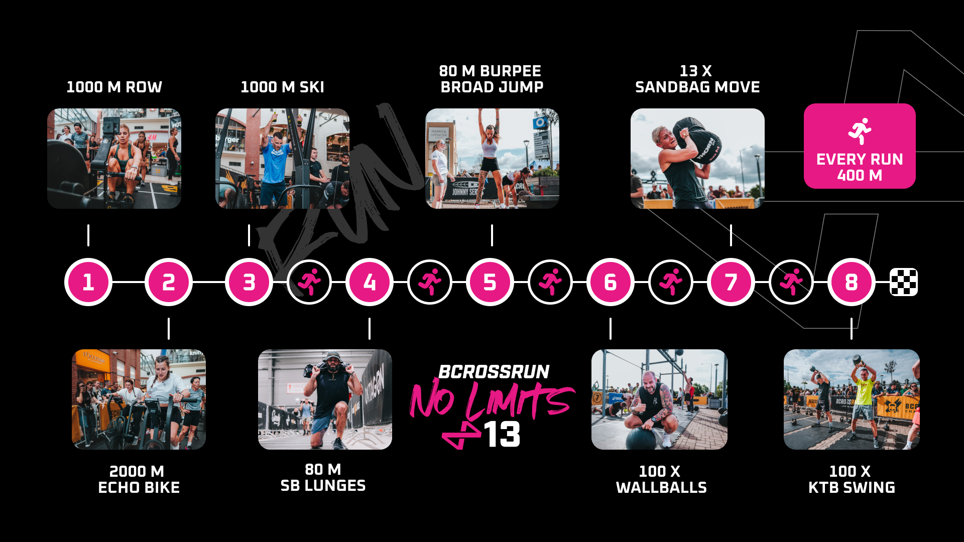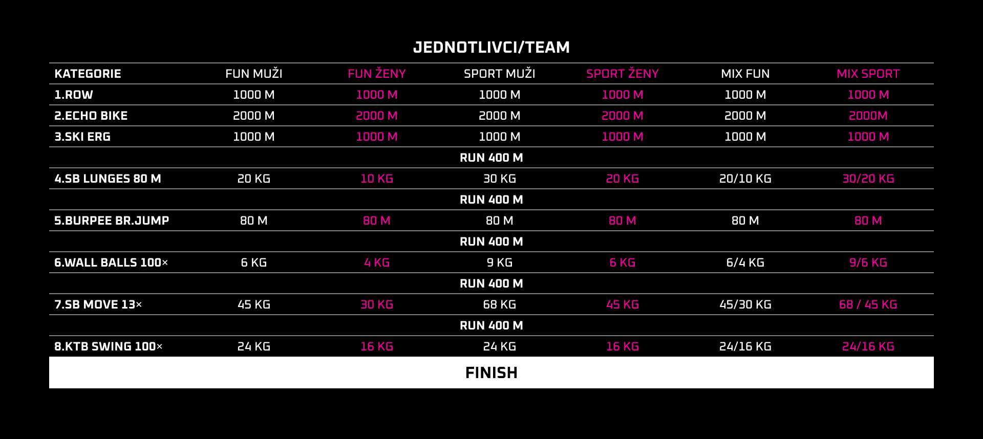 Poté už běžíš 400 m RUN mezi každou disciplínou a pokračuješ přes: